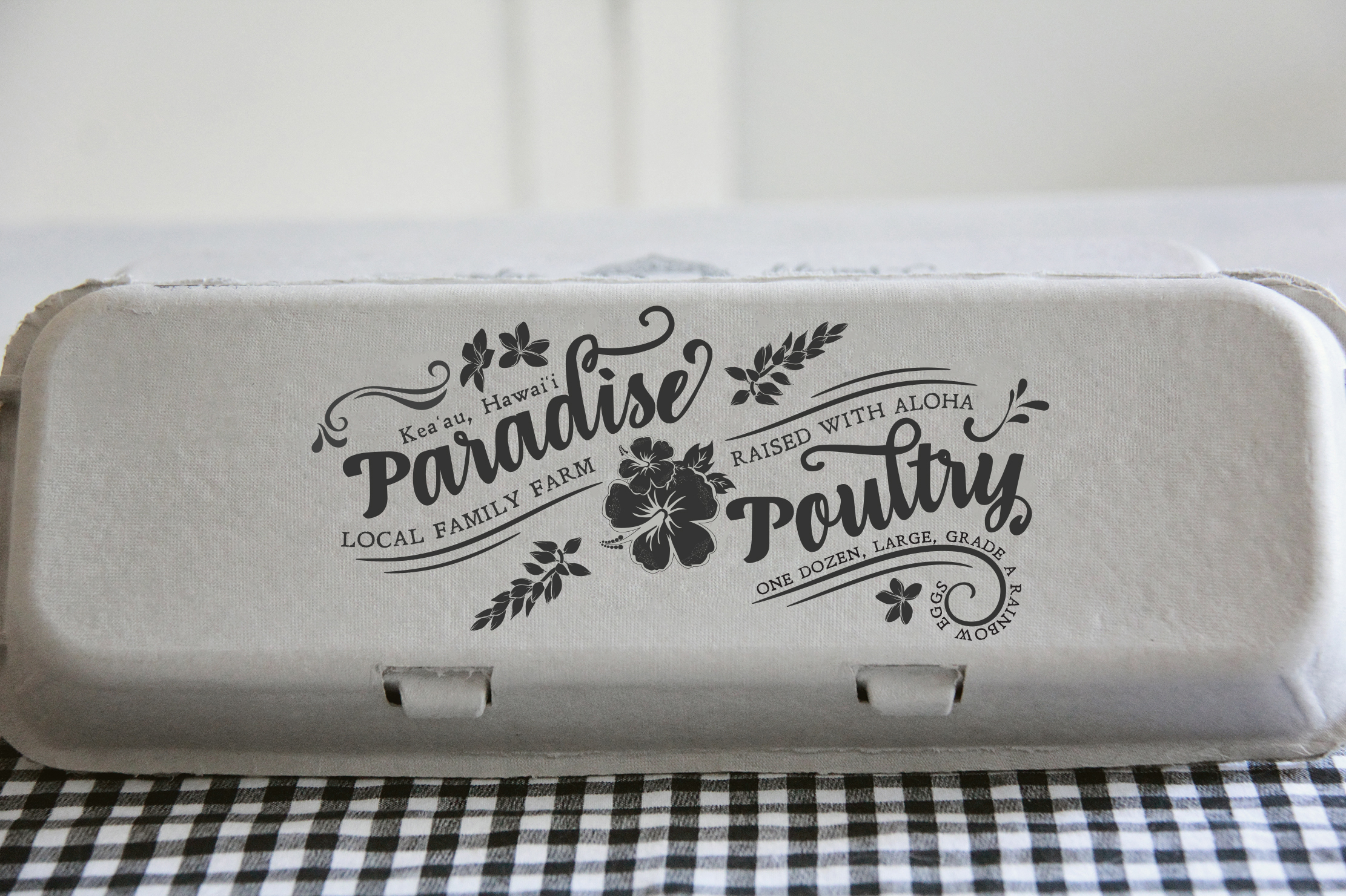 Our stamp reflects exactly what our idea of business is: fresh farm eggs of chickens raised in the colorful Hawaii! Erin was able to capture the Hawaiian lifestyle using some very identifying items of the Hawaiian islands. Thanks Erin!