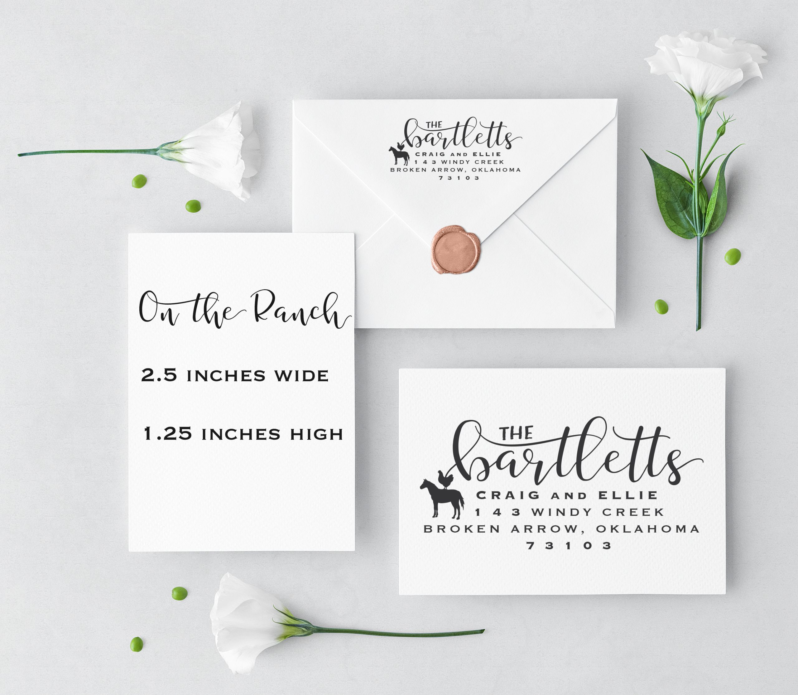 PLEASE NOTE: These stamps measure approximately 2.5 inches wide by 1 inch high. For very long first or last names or addresses containing more than average characters, we recommend choosing the option below to increase the size of your stamp to make sure it is legible. Some of these designs use fonts that are all lower case, if this is an issue for you please let us know so we can choose a different font for you.