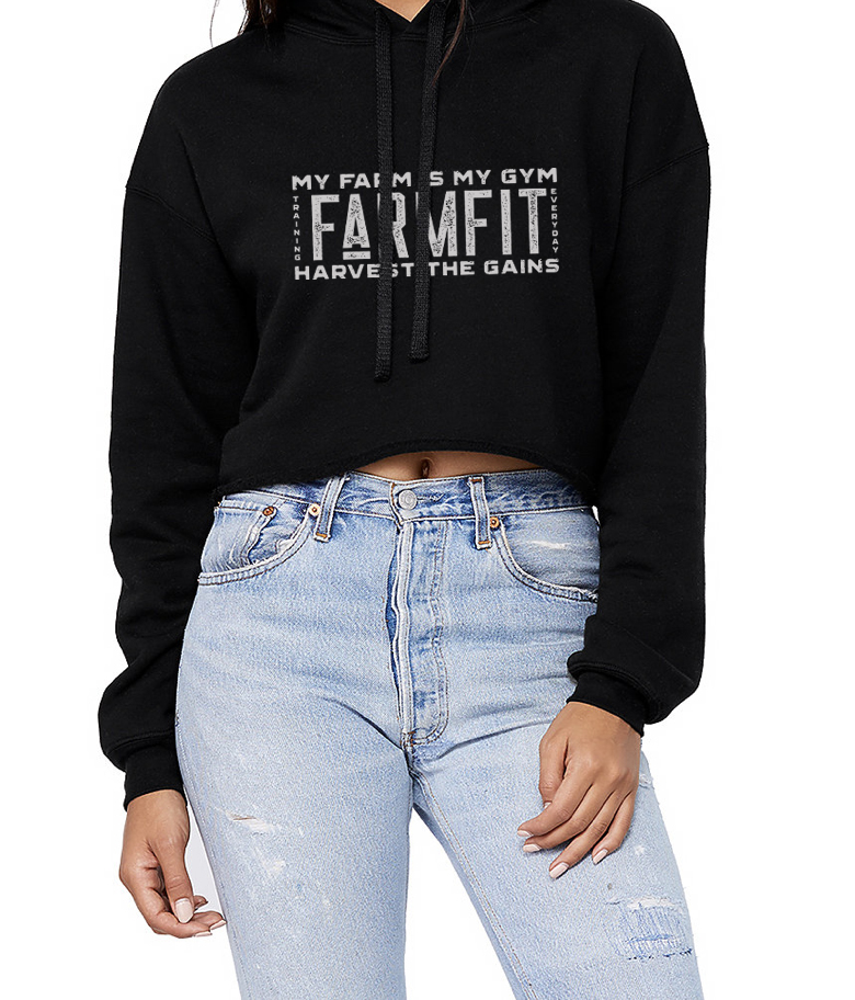 This trendy womens cropped hoodie sweatshirt is a must-have for Fall. Its raw edge and dyed to match drawstrings make it fashion forward while the poly cotton brushed fleece brings an unmatched level of comfort. Printed with the FarmFit Logo